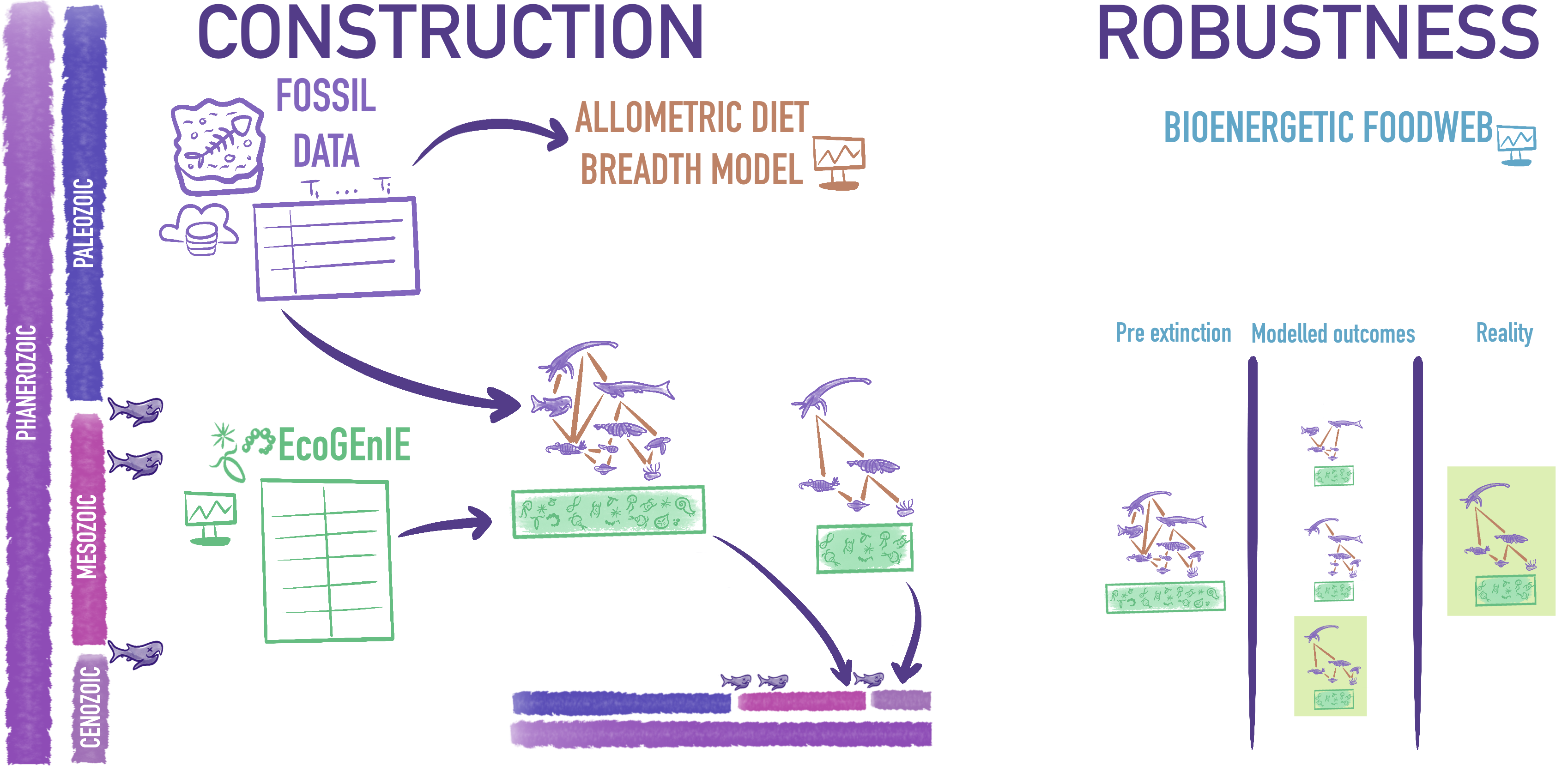 Understanding how ecological networks respond to environmental change requires perspectives that extend beyond contemporary observations. This theme uses paleoecological data and network modeling to reconstruct species interaction networks across deep time, allowing us to explore how networks assemble, persist, and reorganize under long-term environmental dynamics.
